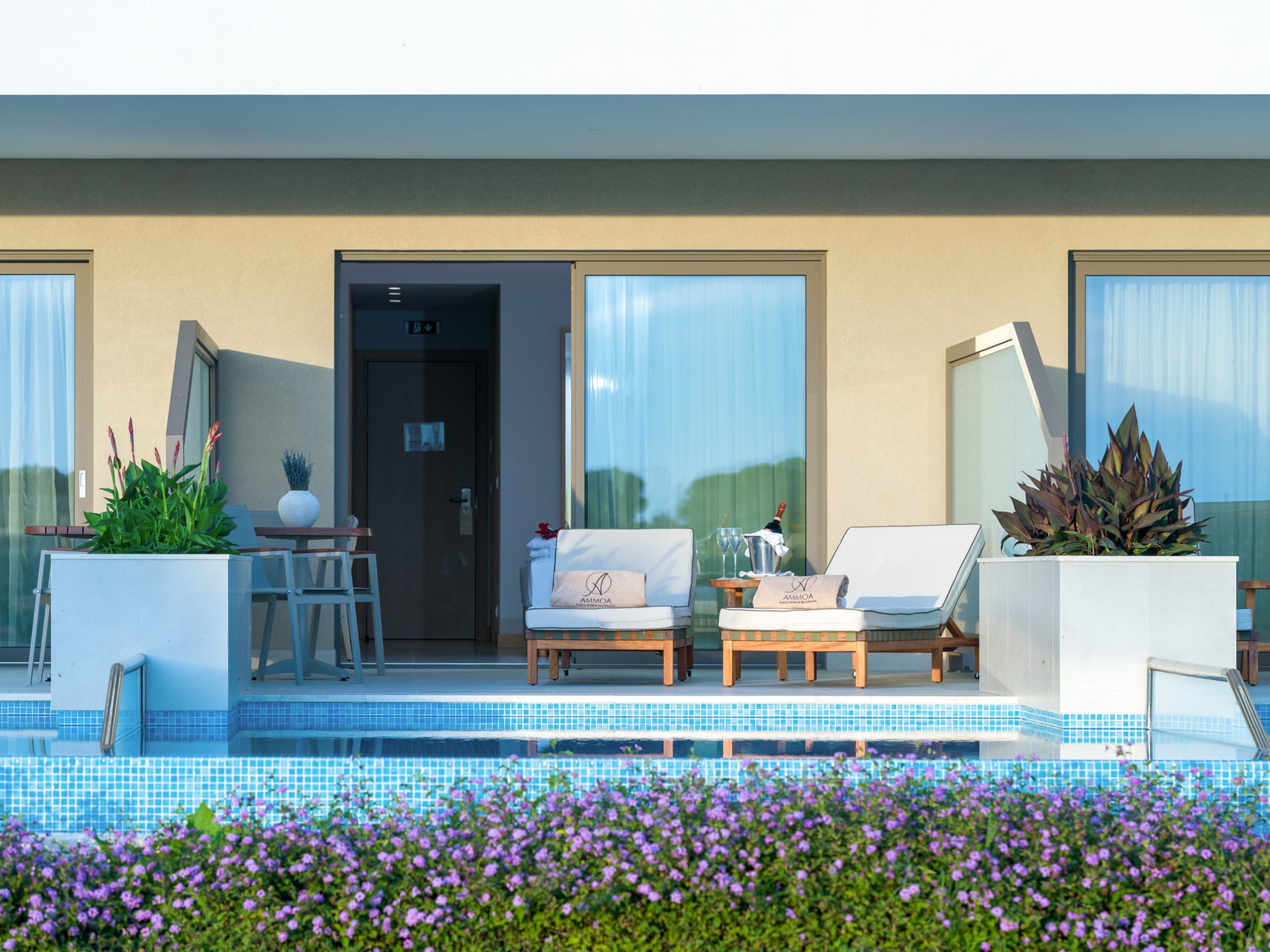Overlooking the mesmerizing sea blue, this deluxe room is spectacular once you enter. The internal color palette and the minimal refinement relieve the feelings. Created to provide the utmost tranquility and comfort, it combines the rejuvenating drops of a private pool with the intimate atmosphere of this special lodging. It stands as the appropriate place to accommodate three adults or two adults and one child on two comfortable beds and a soft sofa-bed.